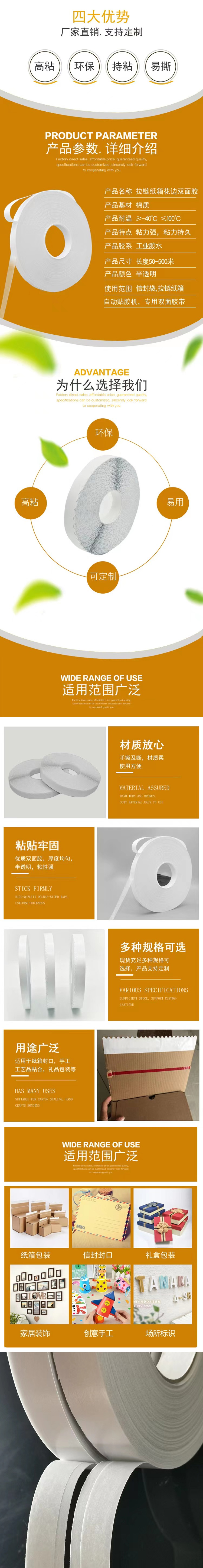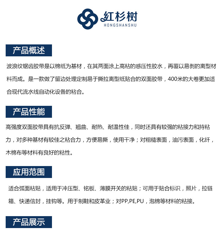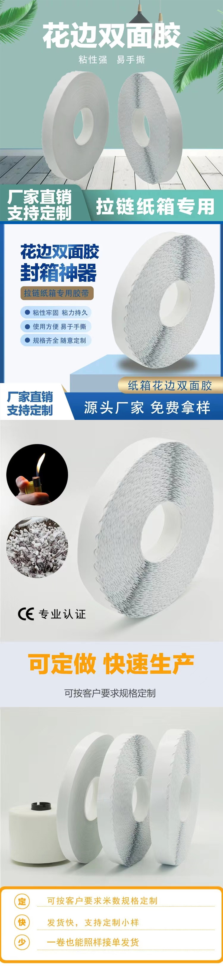 - 波浪紋鋸齒膠帶是以棉紙為基材,在其兩面涂上高粘的感壓性膠水,再覆以易剝的離型材料而成。是一款做了留邊處理定制易于撕拉離型紙貼合的雙面膠帶,400米的大卷更加適合現(xiàn)代流水線自動化設(shè)備的粘合。