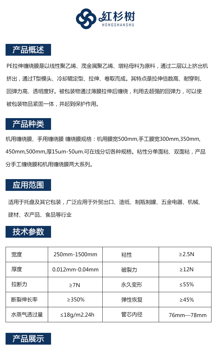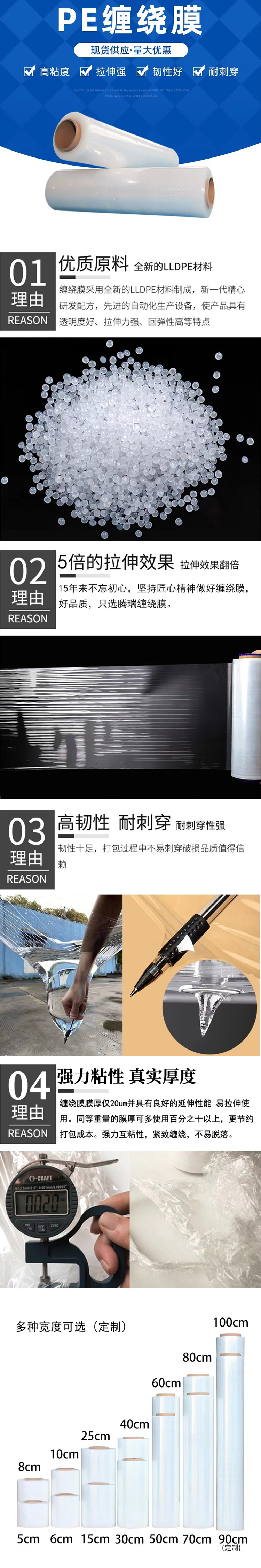 - PE拉伸纏繞膜是以線性聚乙烯、茂金屬聚乙烯、增粘母料為原料,通過二層以上擠出機擠出,通過T型模頭、冷卻輥定型、拉伸、卷取而成。其特點是拉伸倍數(shù)高、耐穿刺、回彈力高、透明度好。被包裝物通過薄膜拉伸后纏繞,利用去超強的回彈力,可以使被包裝物品緊固一體,并起到保護作用。